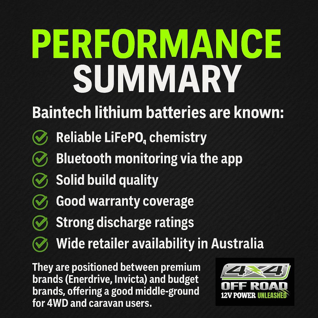Yes. Baintech lithium batteries are designed specifically for Australian conditions and are widely used in 4WDs, caravans, camper trailers and marine applications. Their LiFePO₄ chemistry, solid discharge ratings and Bluetooth monitoring make them well-suited to rough roads, heat, vibration and long-distance touring when installed correctly as part of a quality 12V system.