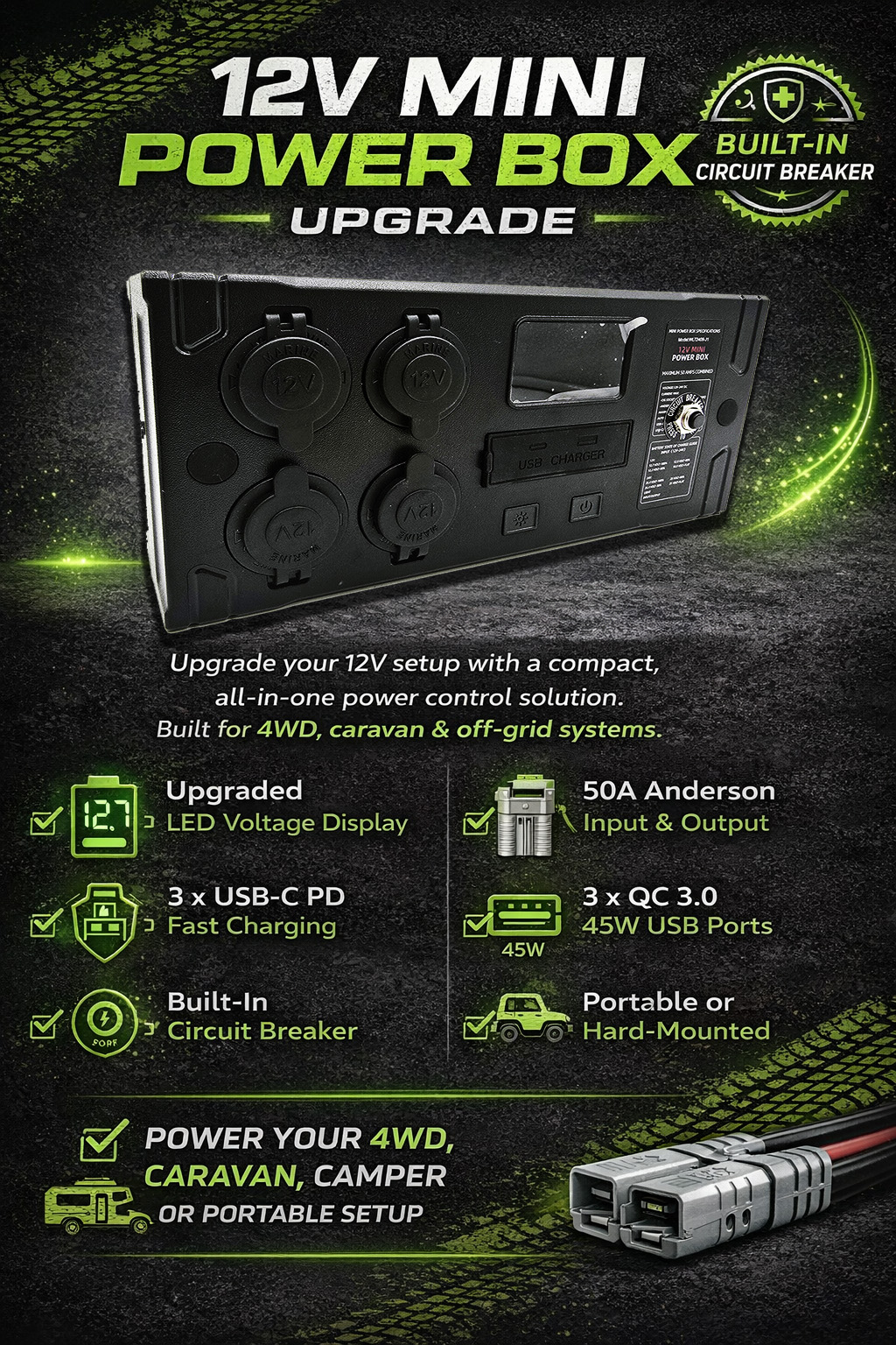 Take control of your 12V power system with this upgraded Mini Power Box, designed for clean installs, reliable performance, and real-world touring use. Built for 4WD, caravan, canopy and off-grid setups, this all-in-one power hub eliminates messy wiring by combining your most-used outlets into one compact control unit.