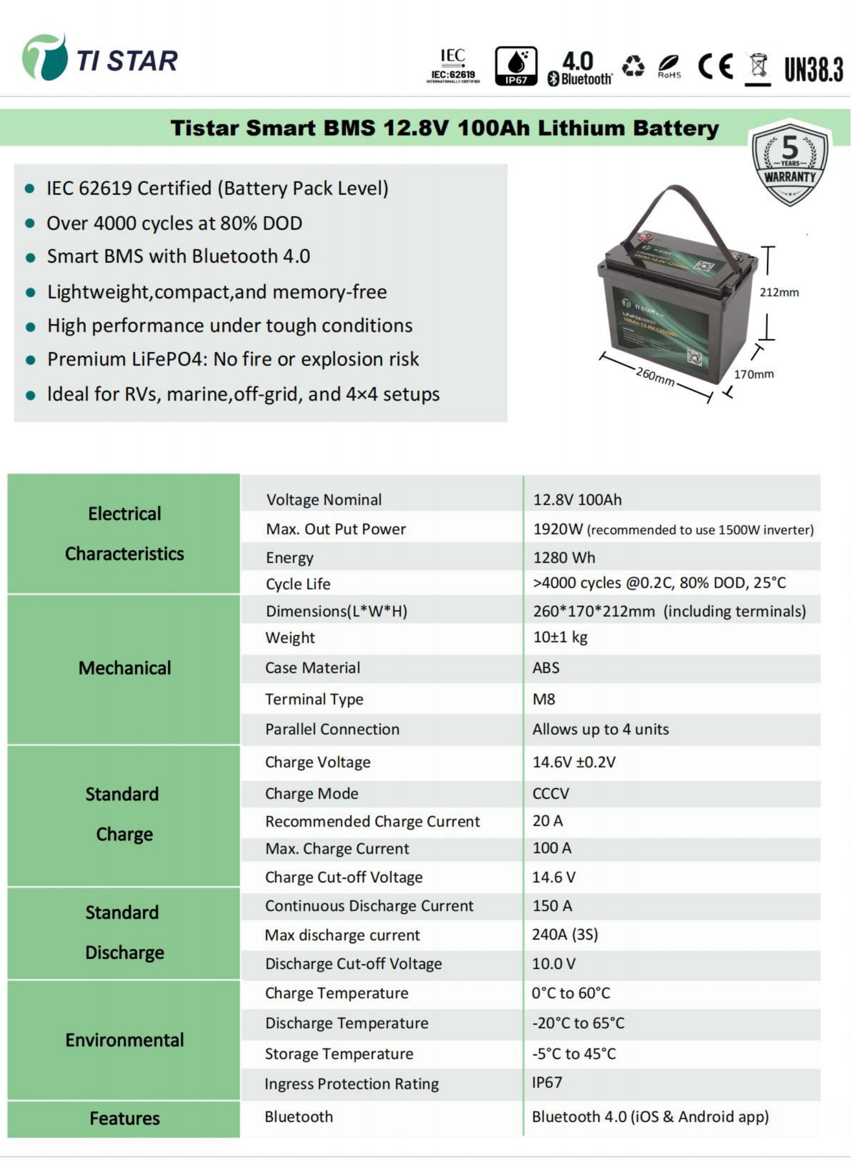 Power your adventures with the Tistar Smart BMS 12.8V 100Ah LiFePO4 Lithium Battery – the ultimate deep cycle solution for 4WDs, caravans, boats, and off-grid setups. Engineered with Grade A LiFePO4 cells and an advanced Smart Battery Management System, this battery delivers reliable, maintenance-free energy with a lifespan of 4,000+ charge cycles.