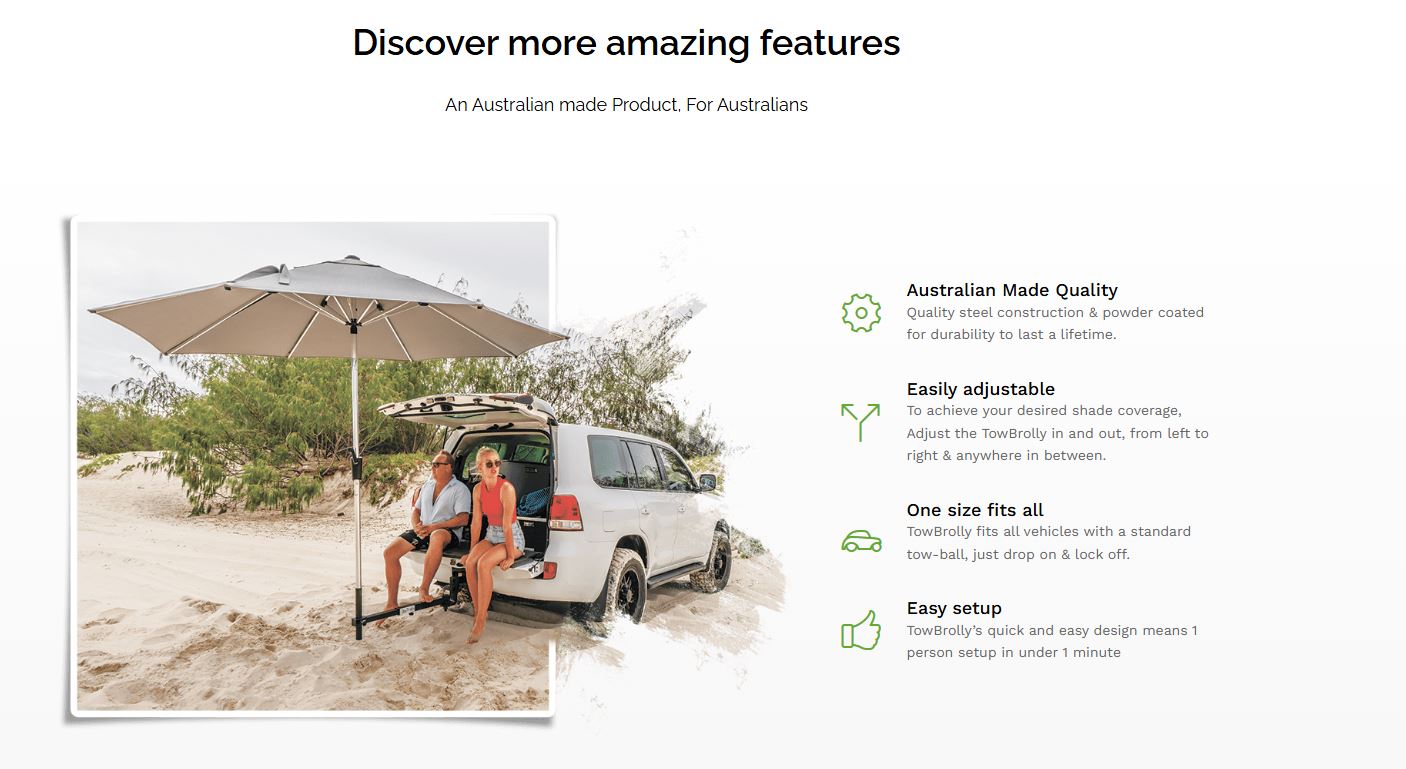 As one of the hottest continents in the world, shade from the sun is important, thus we designed a simple solution to solve all our problems. When it comes to a quick and easy shade setup that requires no ropes, poles, tarps and anything else that wastes time, TowBrolly is your go-to shade solution.