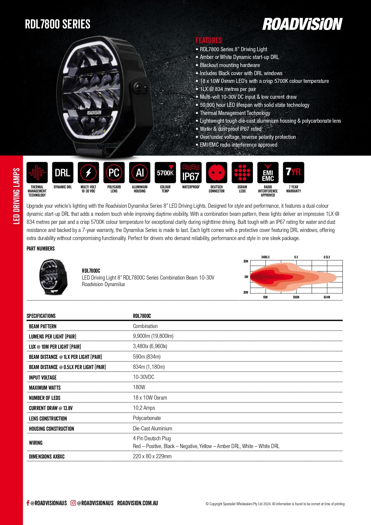 With a combination beam pattern, these lights deliver an impressive 1LX @ 834 metres per pair and a crisp 5700K colour temperature for exceptional clarity during nighttime driving. Built tough with an IP67 rating for water and dust resistance and backed by a 7-year warranty, the Dynamilux Series is made to last.